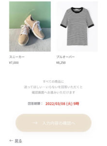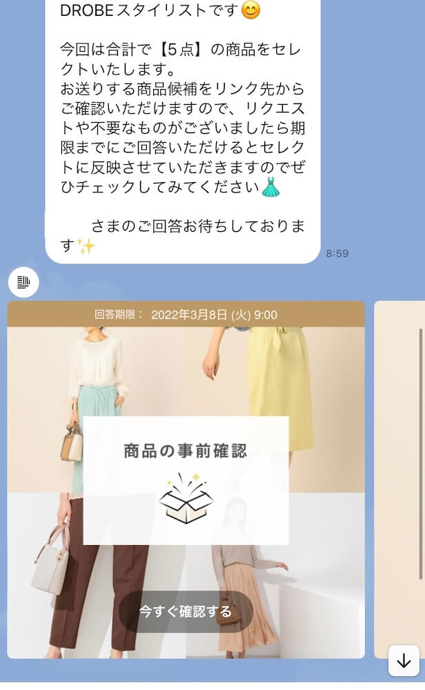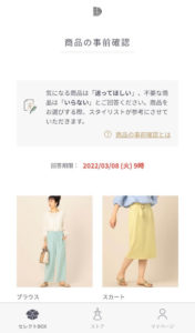 発送予定日の1週間前ごろ、LINEよりスタイリストからの事前提案が届きます。1点ごとに「送ってほしい」「いらない」を回答すると最終的なセレクトに反映されます。(回答期日が短い場合もあるので注意!)