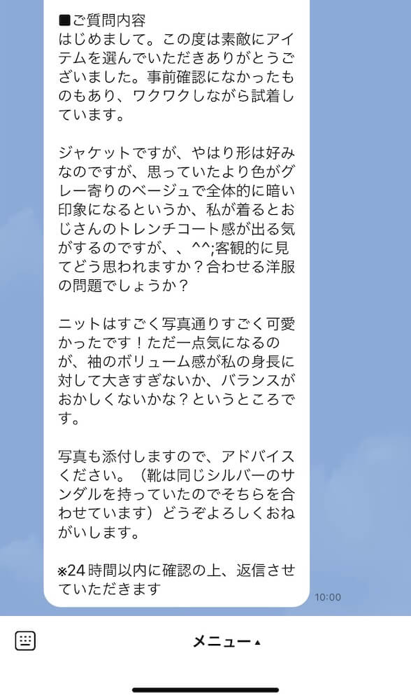 - オンラインのやりとりだけでかなりピッタリの洋服が届いた!