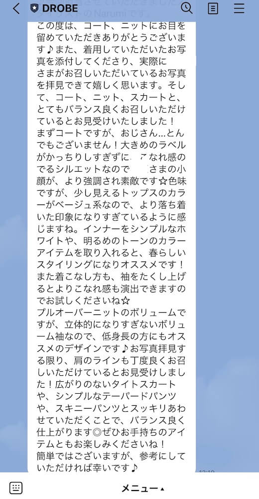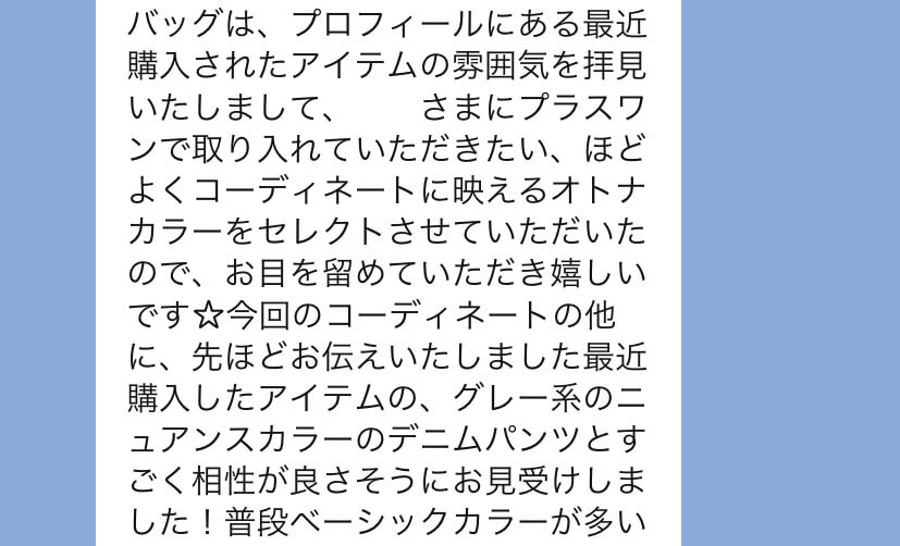 高いかも、、、という心配はあまり必要なく、むしろ洋服選びの手間や時間は短縮でき自分に似合う洋服も見つかって嬉しいことばかりでした♪