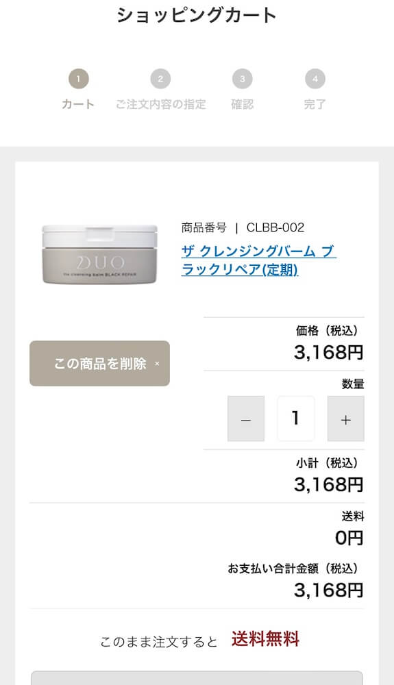 公式通販サイトではDUOクレンジングバームを「通常購入」「定期便」のいずれかで購入することができます。半額になるのは「定期便」。通常購入でカートに入れても半額適用されないのでご注意を!