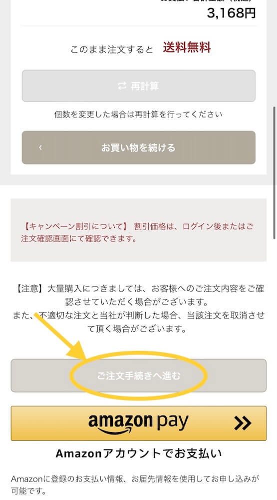 カートに入った時点では定期便の20%OFFが適用されただけの値段ですが、注文画面の最後で半額適用されますので今は3,168円になっていても安心して進んでくださいね。