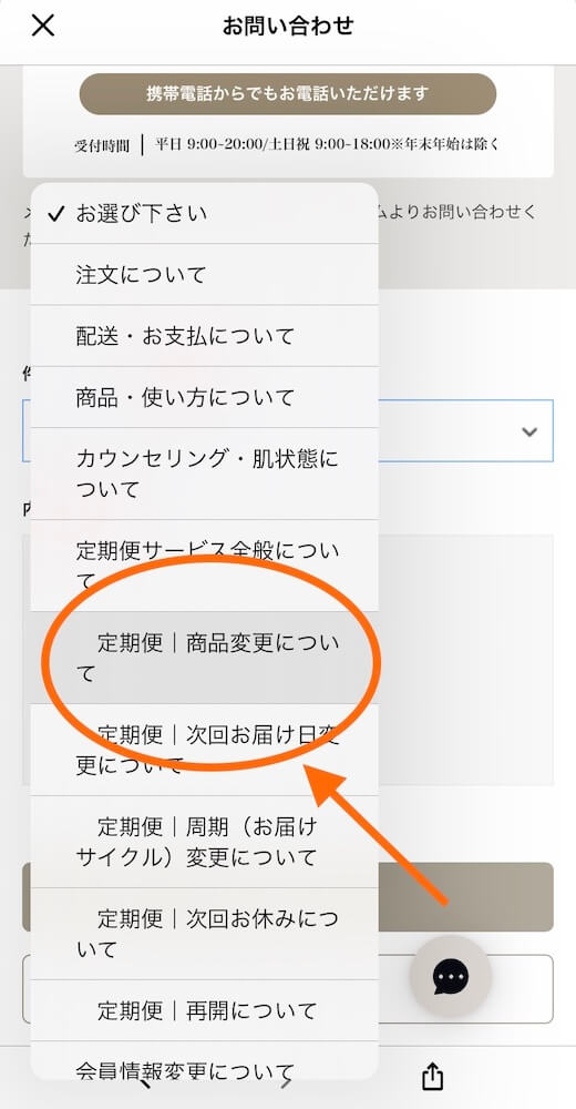 「お問い合わせ」の「件名」から近い内容のものを選びます。