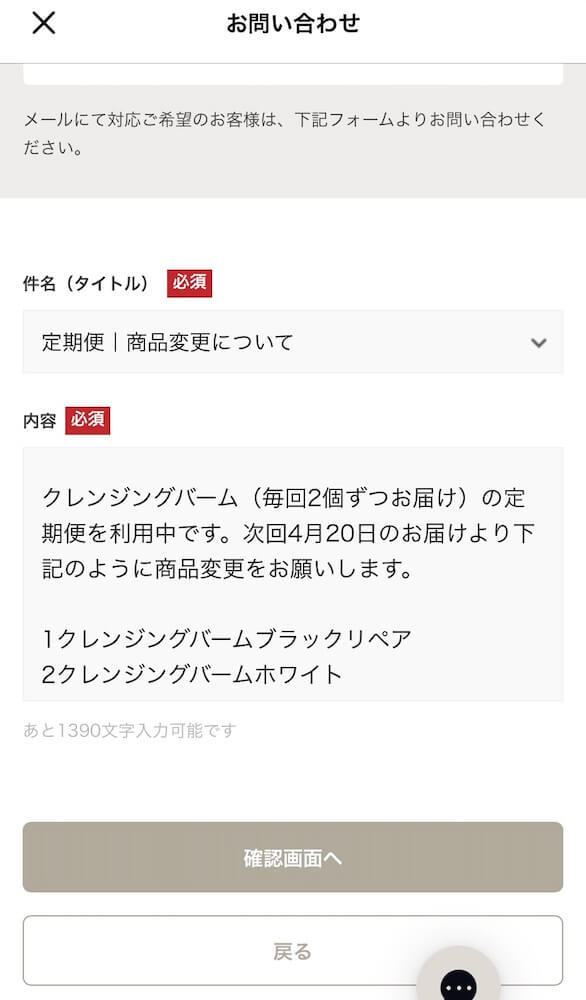 私はずっと「クレンジングバーム(赤)×2」のお届けに設定していました。でも種類がどんどん増えて、悩みに合わせて他の種類を試したいと思うようになったので、2個それぞれ別の種類を届けてもらえないか問い合わせてみました。